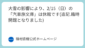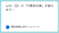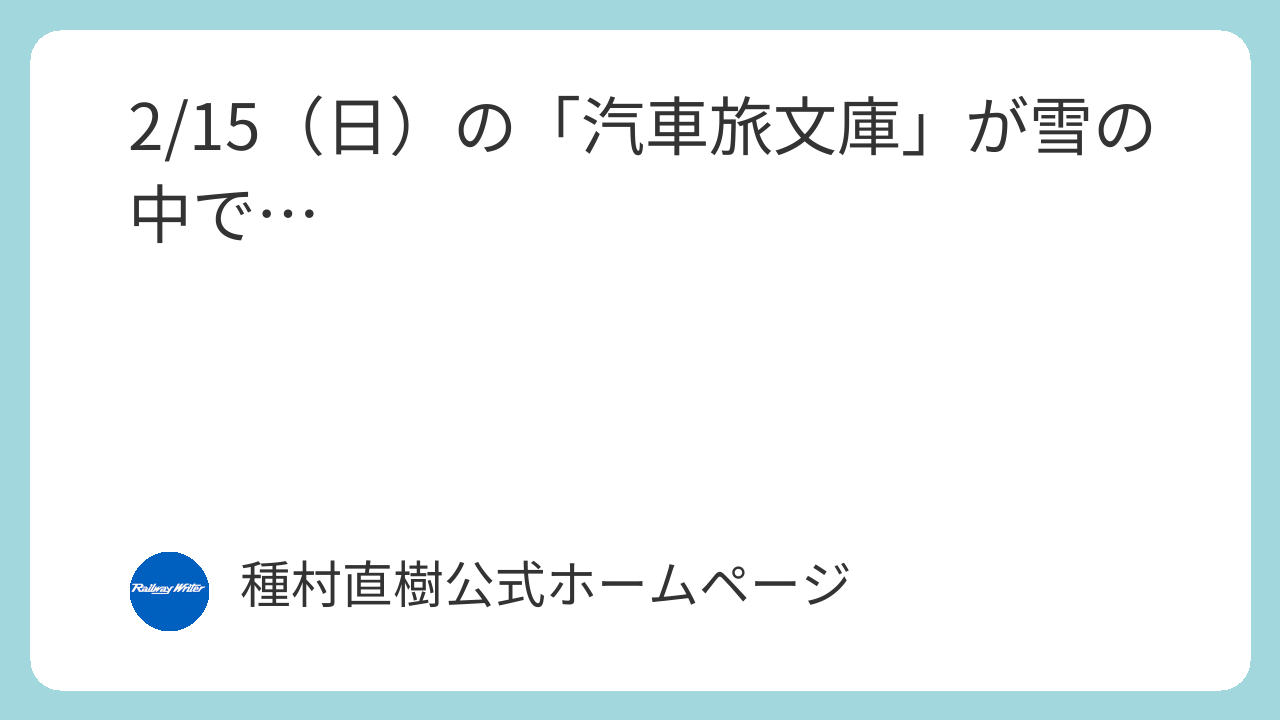 2/15(日)の「汽車旅文庫」が雪の中で… お知らせ一覧 2026.02.11 この記事は約1分で読めます。 「飯詰を元気にする会」からのお知らせです。今月の「津軽鉄道飯詰駅博物館」「汽車旅文庫」が、雪中開館に変更になりました。 お訪ねいただける方は、元気にする会からのメッセージをご覧のうえ、十分に気をつけてお出かけください。 飯詰を元気にする会 ★津軽鉄道時刻表 時刻表 | 津軽鉄道 株式会社津軽鉄道の各駅発車時刻表のご案内です。 ご利用の際はお間違いの無いように。 ★ストーブ列車は見学無料で公開中 「津軽鉄道の運行状況」及び「ストーブ列車の取り扱い」につきまして | 津軽鉄道 株式会社2025年12月29日14時52分頃、先頭の気動車(津軽21形2両)と客車2両との連結部が分離し、全車両に非常